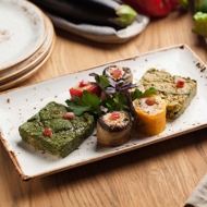 To serve, use a mold (cookie cutters can be used) to shape the spinach and bean mixture onto a plate. Arrange the eggplant rolls and pieces of bell pepper alongside.