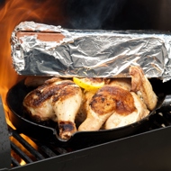 Wrap a heavy brick in foil and heat it thoroughly on the grill grate. Place the chicken breast-side down in the skillet and press down firmly with the brick on top.