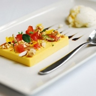 Place a scoop of the mousse onto the other half of the plate with the balsamic cream and panna cotta. Gently tap the mousse with a spoon to break it open, revealing the passion fruit core inside, like the yolk of an egg.