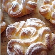 Brush the buns with sweetened milk and let them rise in volume, bake for about 15–20 minutes in a preheated oven at 356°F. Dust with powdered sugar.