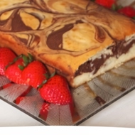 Pour half of the white batter into the pan and smooth it out with a spatula. Pour in the chocolate batter and top with the remaining vanilla batter (do not mix yet). Now, use a knife to create a light pattern in the raw batter (S shape or zig-zag back and forth). But don’t overdo it, or the marble effect will be lost.