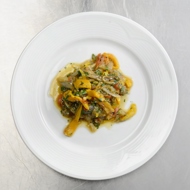 Peel the vegetables, removing the skins, stems, and seeds. Cut them into thin strips.