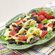 Mix the strawberries, turkey, peaches, and apple. Dress the salad and add salt.