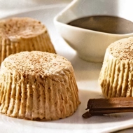 Invert the parfaits, remove the liners, dust the dessert with cocoa, and serve with chocolate sauce.