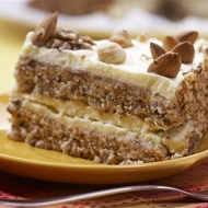 Place one cake on a plate, spread a layer of cream mixture on it, smooth it out, and cover with the second cake. Spread the top of the cake with the cream mixture, sprinkle with chopped, browned almonds from the oven, and serve.