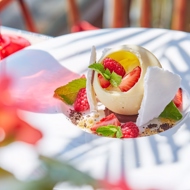 Plate the dessert and garnish with meringue, fresh mint leaves, and strawberries and raspberries. Enjoy your meal!