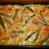 On the final layer of lasagna sheets, add the remaining homemade cheese diluted with water. Place the reserved asparagus tops on top and sprinkle with Parmesan.