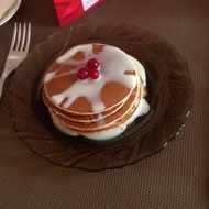 Stack on a plate and drizzle with toppings.