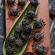 Form meatballs by scooping 2 tablespoons of the mixture at a time and rolling it into a ball. Insert eight noodle legs into each ball, four on each side. Place on the prepared baking sheet.