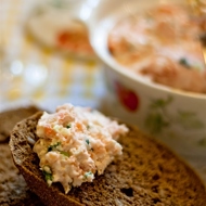 Chop the salmon and boiled eggs using a blender.
