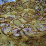 Place the apple slices at the bottom of the dish and pour the batter on top.