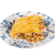 Divide the dough into 2 parts: 200 grams and 520 grams. Place the smaller portion of the dough in the bottom of a baking dish, then add the filling, and top with the second layer of dough. Smooth the surface and bake in an oven preheated to 302°F for 45 minutes.