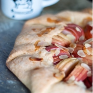 Roll out the dough into a circle with a diameter of 30 cm and a thickness of 3–4 mm, transfer it to a baking sheet lined with parchment paper, and arrange the apples on top, leaving 4–5 cm from the edge. Drizzle with honey (you can use more than specified if the apples are not sweet enough), evenly distribute the remaining butter on top, fold the edges, and sprinkle with a little chopped almonds (or almond flakes).