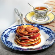 Layer the caramelized apples on top of a pancake, then place another pancake on top, followed by more apples, and repeat until all the pancakes are used. Finish with a layer of caramelized apple slices on top.