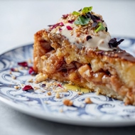 Cut the pie into 12 pieces, then top with Greek yogurt, honey, walnuts, mint, and dried rose petals.
