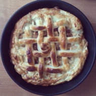 Roll out thin strips from the remaining pastry (9 pieces) and attach each to the edge of the pie. Braid the "lid". Decorate with the remaining pastry as desired.