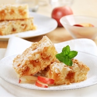 Prepare the pie base. Sift 75 g of flour and baking powder into a bowl, add 50 g of butter, 25 g of almonds, the egg, milk, and 50 g of granulated sugar, and knead the dough. Add the apples and transfer the dough to a greased baking dish.