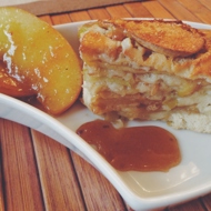 For decoration, I used caramelized apples. They are very quick and easy to make. Slice the apples into wedges. Melt butter in a skillet. Place the apple wedges in the skillet. Sauté the apples until golden brown (the apples should be soft). Then add sugar to the apples and stir until each wedge is coated in caramel.