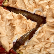 Place the batter in a deep baking dish, top with grated apples, and then add the meringue. Bake in the oven at a low temperature until the meringue is fully cooked.