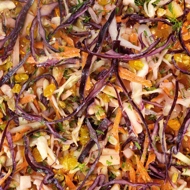Finely shred one fork each of red and white cabbage. Firmly knead the resulting strips on a cutting board and let them rest for about fifteen minutes.