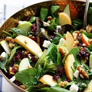 Arrange the spinach leaves, apple slices, cranberries, gorgonzola, and pine nuts. Drizzle with the honey dressing.