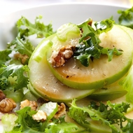 In a bowl, mix the orange juice, olive oil, 1 tablespoon of honey, and finely chopped mint. Add the watercress and diced apple.