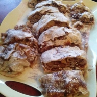 It is best to serve the strudel warm, cut into crosswise pieces 2–3 inches thick.
