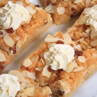 Using a mixer, beat the softened butter and sugar together. Add the almond extract, then the flour and salt. Mix well. Transfer 1 cup of the dough to another bowl and add the almond paste, mixing well with your hands. Add half of the sliced almonds.