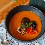 Serve the apricot porridge in a deep bowl, drizzled with a spoonful of urbech, topped with dried fruits, almond flakes, and garnished with a sprig of mint.