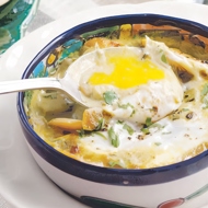 When the rice is almost ready, crack the eggs into each corner of the skillet, wait for them to cook, sprinkle with herbs, remove from heat, and serve.