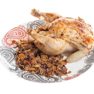 Amich is sometimes referred to as Armenian chicken. The essence is that the chicken is roasted, stuffed with rice and dried fruits. It turns out sweet and spicy: the rice is mixed with dates, apricots, almonds, and raisins, seasoned with cloves, cinnamon, and black pepper. Most likely, there will be more rice with dried fruits than needed to stuff the chicken—feel free to place it in a baking dish alongside.