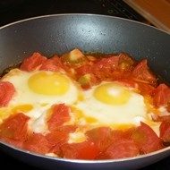 Let the eggs lightly fry, stirring them gently with the tomatoes.