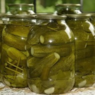 Pack the cucumbers, pour hot boiled water over them for 15 minutes. Drain the water. Add salt, sugar, and table vinegar to the water. Bring the spiced water to a boil again and pour it into the jar. Seal the jar.