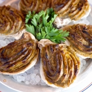 Transfer the paste to a piping bag with a decorative tip and cover the oysters with the paste. Place the baking tray in the oven and cook for about 5–7 minutes.