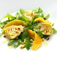 Arrange the arugula, orange segments, and artichokes on a plate, drizzle with the dressing, and sprinkle with lightly toasted pine nuts.