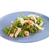 Arrange the arugula on a plate, add the shrimp on top, drizzle with the wine sauce from the skillet, garnish with slices of Parmesan, and season with salt and pepper.