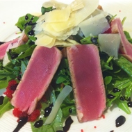 Season the tuna with salt and pepper, sear in garlic oil on both sides until medium rare (pink inside), and slice thinly.