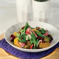 Arugula Salad with Olives, Sun-Dried Tomatoes, and Salami