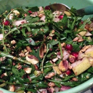 Combine arugula, romaine lettuce, and pomegranate seeds. Cut the pears into cubes and add them to the greens.