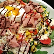 Dress the salad with the sauce. Top with canned tuna and poached egg, making a small cut in the egg to release the yolk. Drizzle with balsamic sauce if desired.