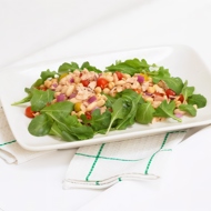 Add halved cherry tomatoes, thinly sliced red onion, tuna, beans, and arugula to the dressing. Gently toss everything together and plate. Top with shaved Parmesan.