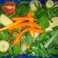Place the greens in a salad bowl, cut the cherry tomatoes in half, and add them to the greens. Cut the baby corn (I used marinated baby corn) into small pieces and add them to the salad.