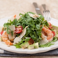 Place the arugula leaves in the center of the plate, then arrange the shrimp, Parmesan cheese, and tomatoes alternately around the salad. Drizzle with dressing, sprinkle with pine nuts, and serve.