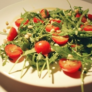Chop the tomatoes, preferably in large, random pieces. Add them to the arugula.