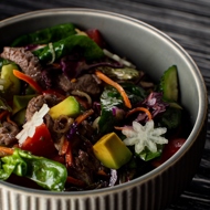 Combine spinach, tomatoes, bell pepper, cucumbers, and avocado in a salad bowl. Add roasted kohlrabi and pieces of steak.