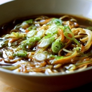 Cut the carrot into thin strips, chop the bell pepper, garlic, and ginger into cubes, sauté, and add to the broth along with the soy sauce.