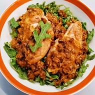 Place the cooked chicken on the arugula.