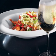 A simple demonstration of what is called Asian style. The chicken is sautéed in a coating made of flour, sesame oil, and soy sauce, and then the entire salad is dressed with the same liquid ingredients, adding maple syrup (for a more authentic Asian touch, palm sugar can be used). The finishing touch is textural. Sprinkle the salad with chopped nuts.