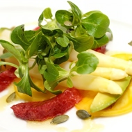 Peel and chop the avocado, asparagus, jicama, and grapefruit. Remove the white membranes from the grapefruit for a sweeter salad taste.