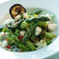 Cut the cooled asparagus into three parts, combine with the leeks, chili pepper, and eggplants, sprinkle with green onions and pumpkin seeds, and drizzle with the remaining oil.